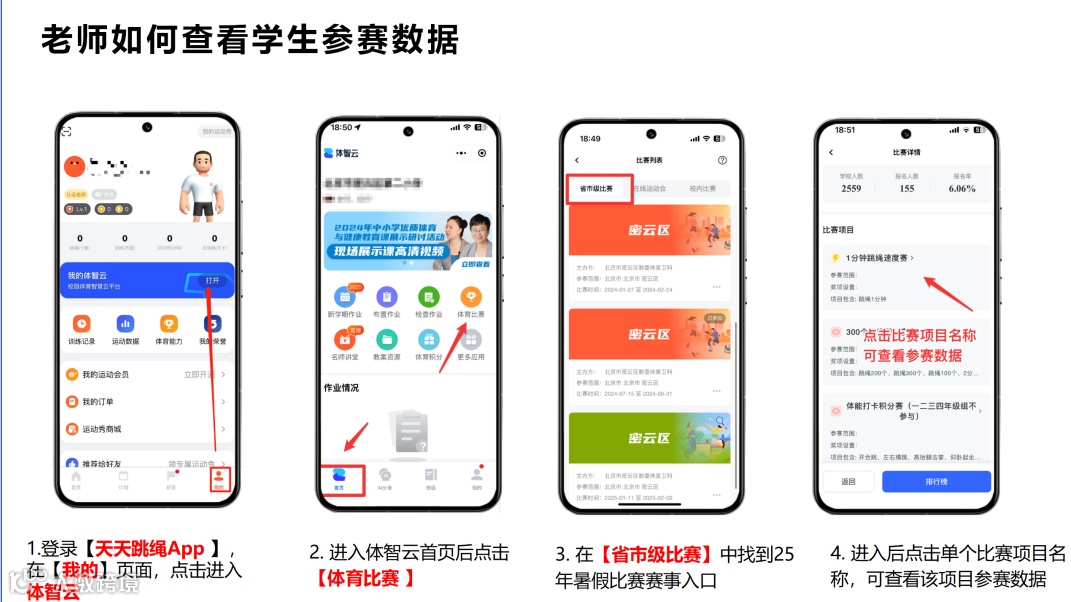 1.移动客户端:已认证的学校管理员和班级管理员打开“天天跳绳”App,点击“我的”—我的体智云—打开—体育比赛—省市级比赛,查看本校、班级赛事数据。(可参考图片操作)