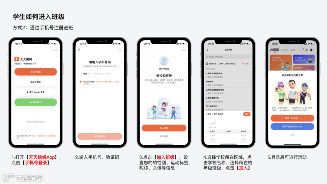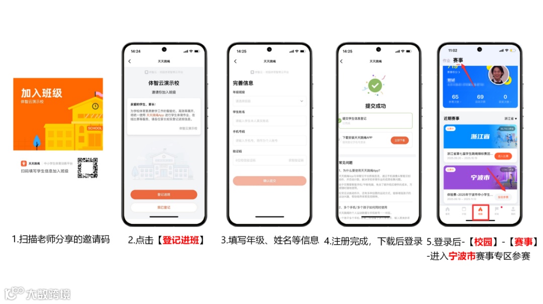 学校老师需下载“天天跳绳App”申请老师认证,完成认证的老师可在“天天跳绳App”内生成学校邀请码,发送至班级群,学生扫码加入正确年级、班级后,下载“天天跳绳App”,在【校园】中进入赛事专区,报名参赛。