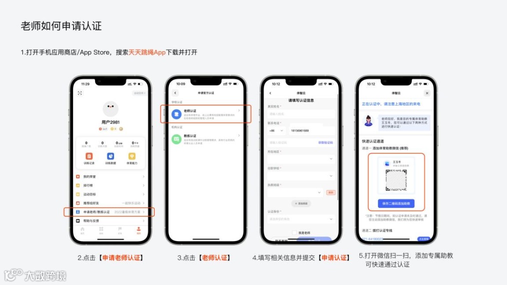 手机端下载“天天跳绳App”,注册后进行“体育老师/班主任/学校管理员”认证,提交相关信息后请添加对应助教完成操作,流程如下图: