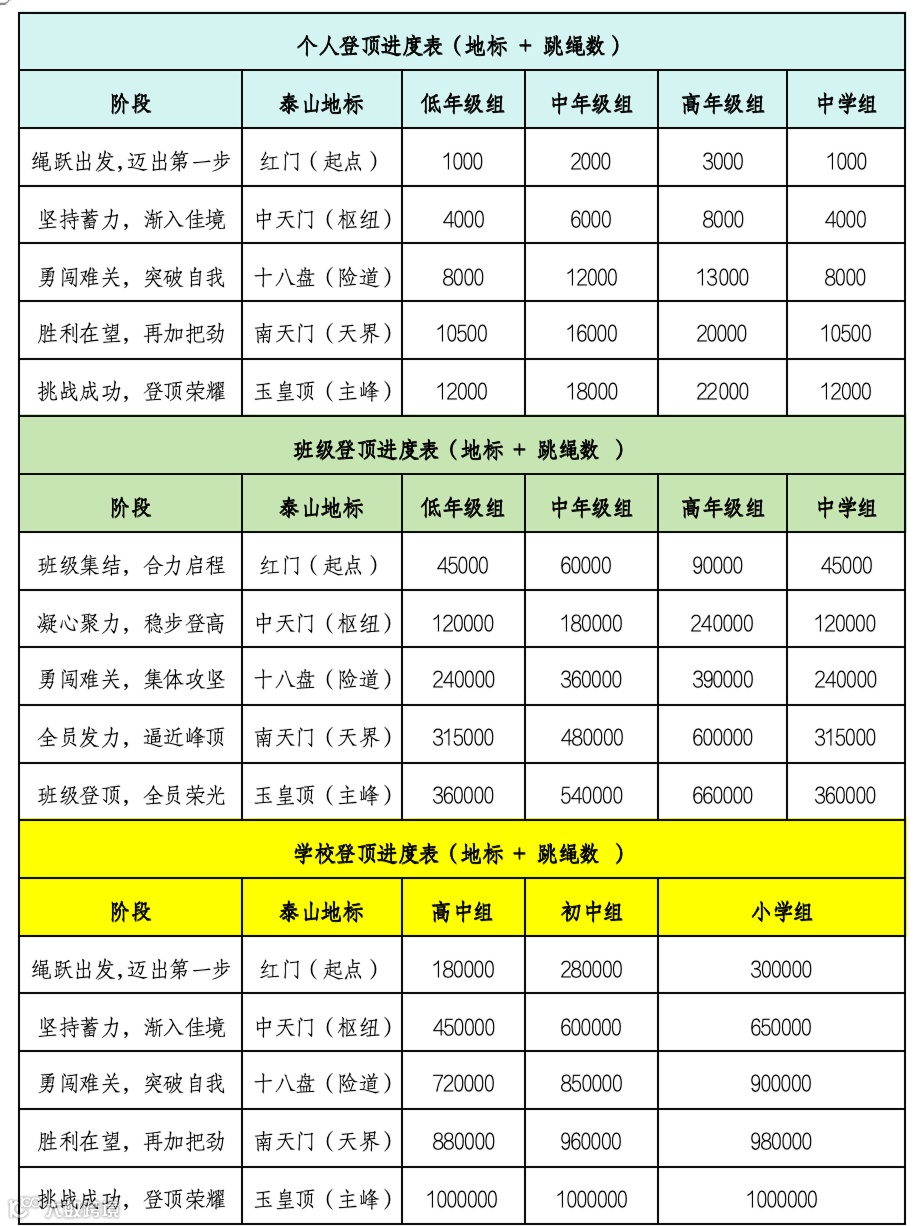以“泰山登顶”为核心主题,累计师生有效跳绳个数到个人、班级、学校。个人跳绳总个数助力自身逐步解锁泰山地标、完成登顶挑战;个人成果同步汇聚为班级总进度,班级进度再汇总形成学校总进度,三位一体,合力推进,登顶泰山。活动时间(开始、结束时间除外)为每天7:00-22:00,其它时间平台不开放,每人每天最多计入1000个跳绳,超过个数不计入。