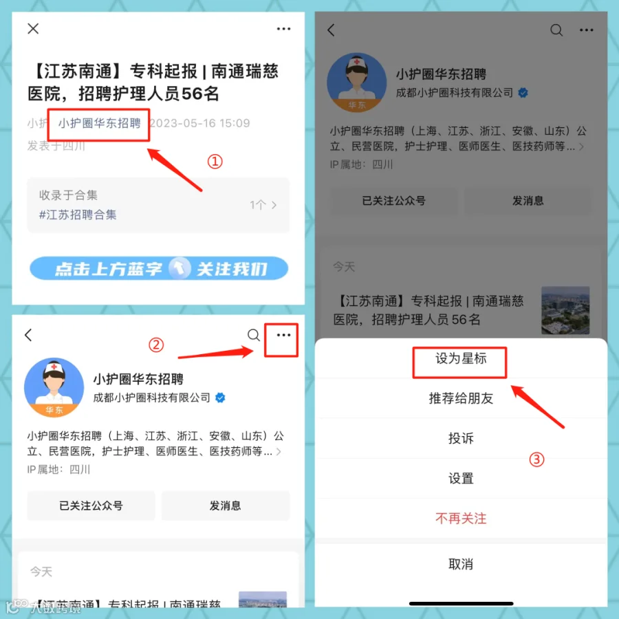由于微信公众号改版,很多读者朋友反映,最近在订阅号列表里找不到我们了。为了防止和我们走散请给公众号“小护圈华东招聘”设个星标吧!