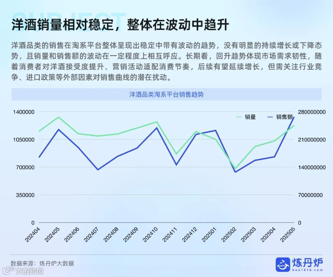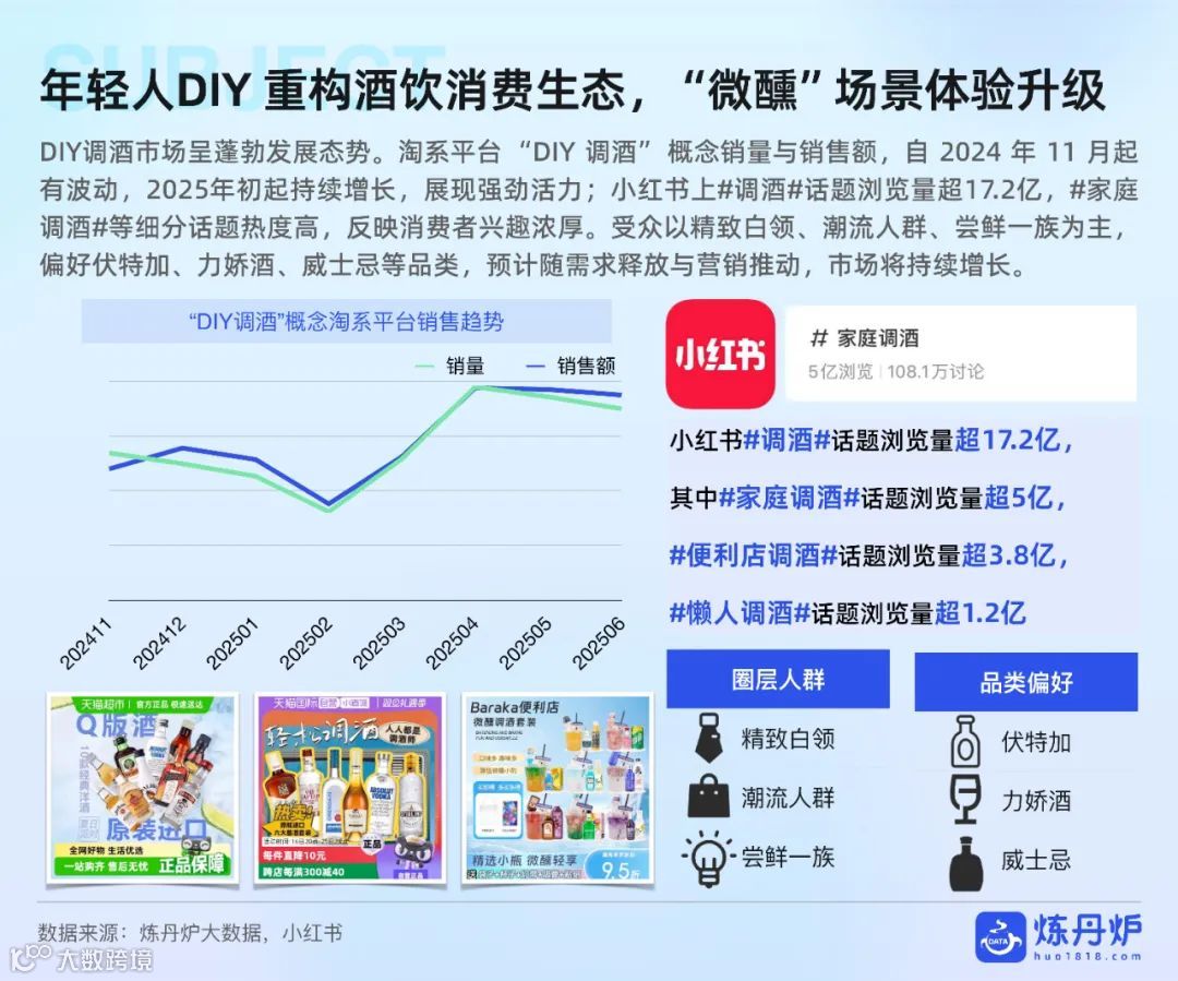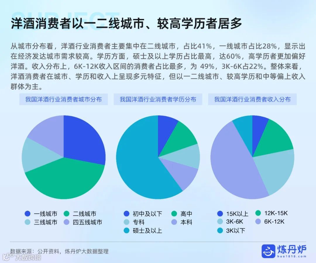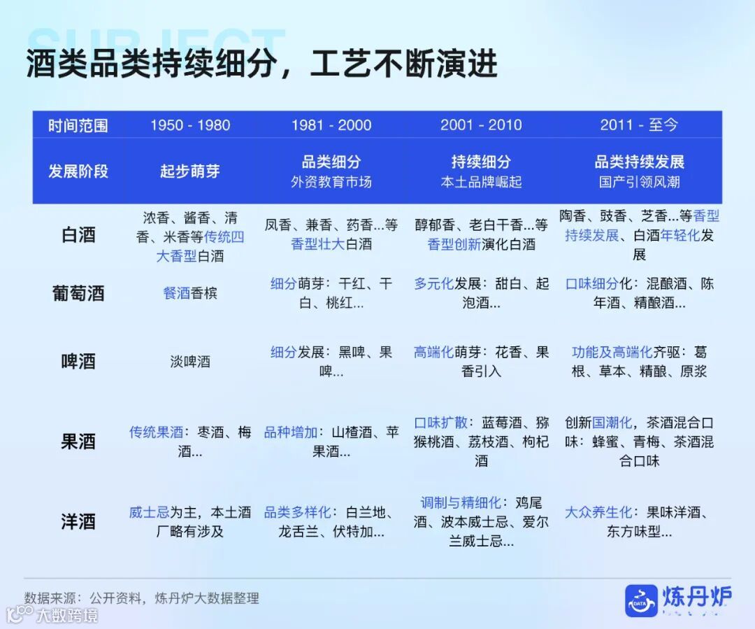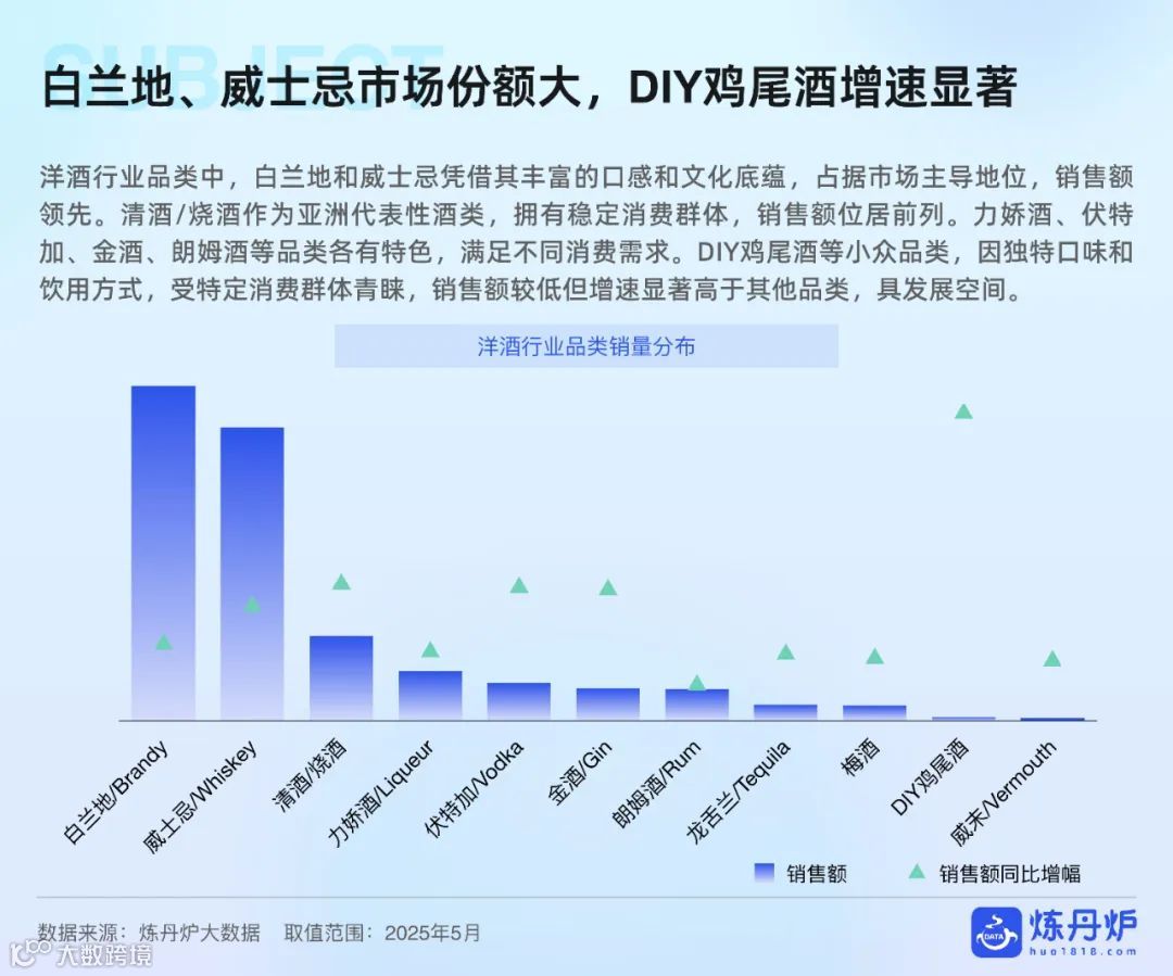 白兰地与威士忌占据洋酒主流市场,而DIY鸡尾酒增速最快,体现年轻消费者对个性化饮酒方式的追求。