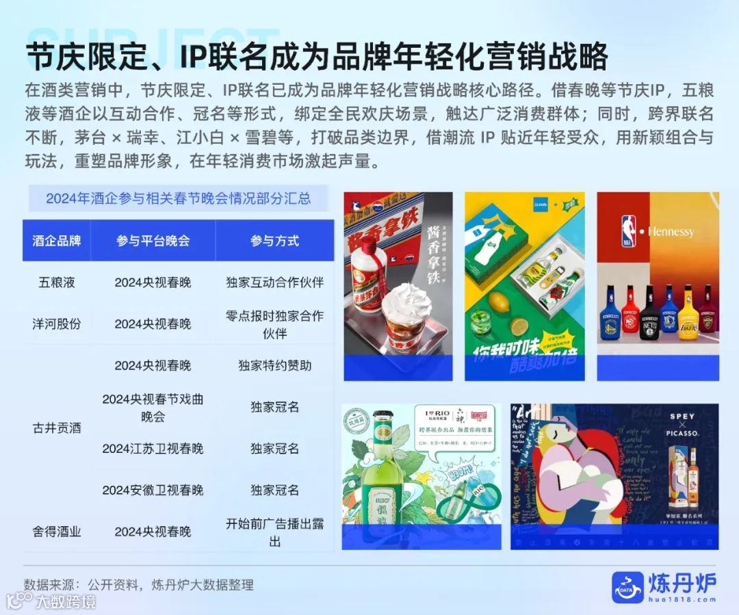 酒企通过艺术化瓶身设计、节庆限定款、IP联名等方式强化产品文创属性,提升社交传播价值,吸引年轻人拍照分享并完成转化。