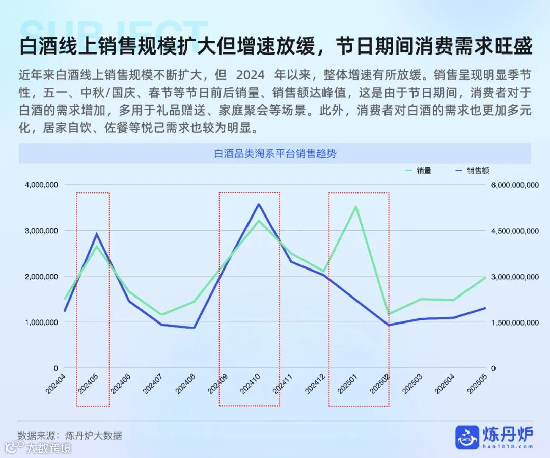 2016—2024 年,中国酒类市场持续扩容,线上渠道已成为主要销售阵地,电商平台贡献了54.2%的销量。传统节令如五一、中秋、春节成为消费高峰,销售峰值显著高于618、双11等电商大促,节日氛围有效激发购买需求。
