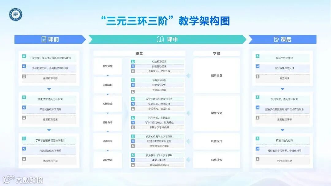 姜涛的要求远非“会用”,而是要求教师团队“用好”“善用”。为此,结合应用现状和教学中的普遍困境,姜涛梳理出“三元三环三阶”教学架构图,用以指导教师将技术手段有机融入教学全过程、夯实课堂育人质量。