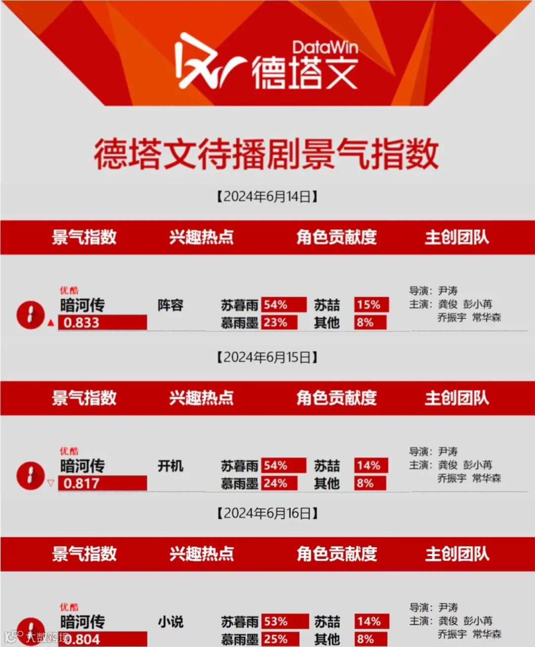 目前待播剧《我们与法庭的距离》《风过留痕》《暗河传》将助其解锁法官、刑警、江湖高手等全新角色。其中《暗河传》官宣次日即登顶德塔文待播剧景气榜,龚俊饰演“苏暮雨”角色贡献度超50%,初步展现扛剧实力。
