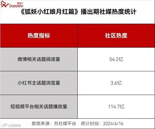 《狐妖小红娘月红篇》在爱奇艺首播日热度达7225,创2024年开播纪录,两日内站内热度突破9000。微博话题阅读量超50亿,小红书主话题浏览量破3亿,短视频平台相关播放量逾110亿,成为现象级社交话题。
