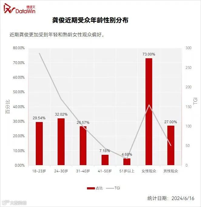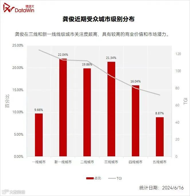 德塔文数据显示,龚俊受众覆盖年轻至轻熟龄女性,聚焦一二线及新一线城市,同时广泛辐射下沉市场,结构均衡,具备强劲商业价值与传播势能。