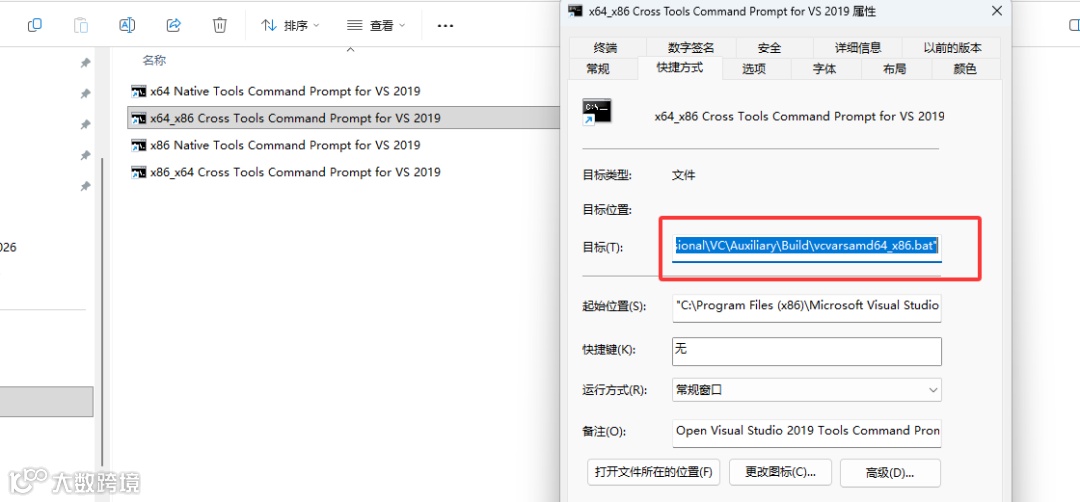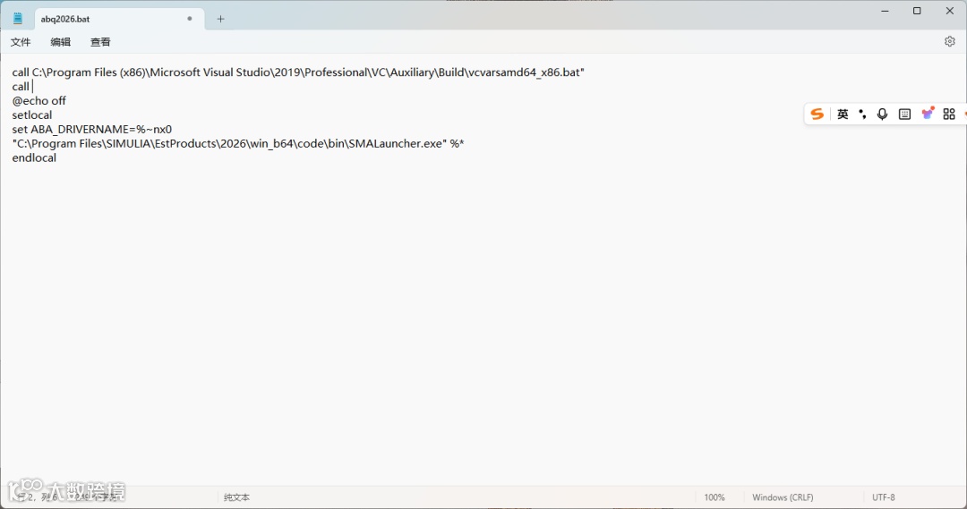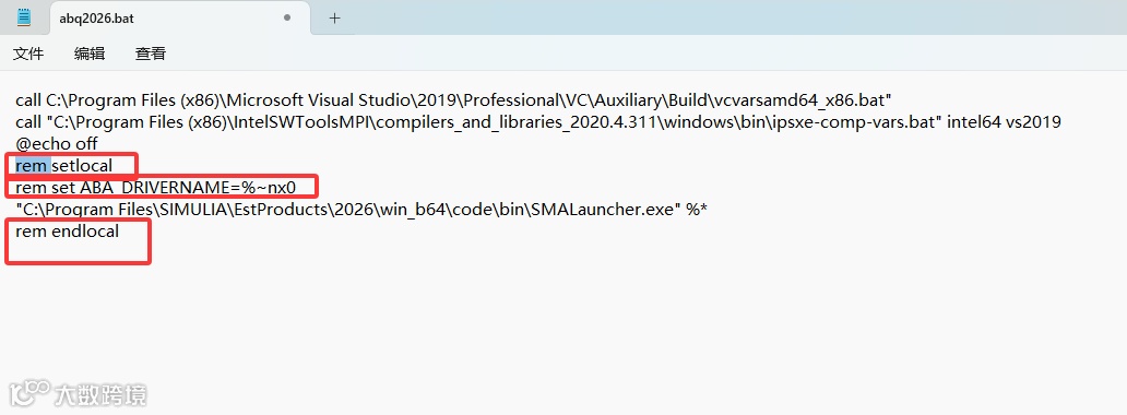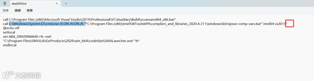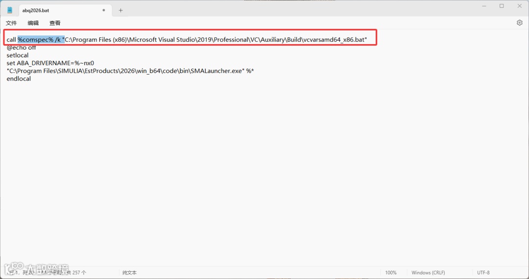 33、在打开的abq2026.bat文件输入call+空格然后粘贴前面复制的VS目标路径。输入完成后将下图选中部分删除{%comspec% /k "},参考下图。