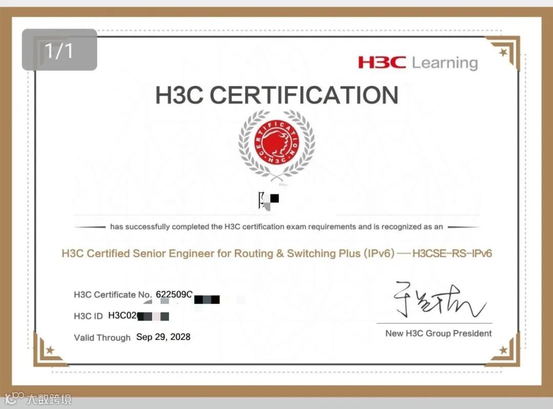 H3CIE(技术专家):顶尖级认证,要求具备官方培训记录,通过笔试、实验、面试三重考核,是行业技术权威的象征。