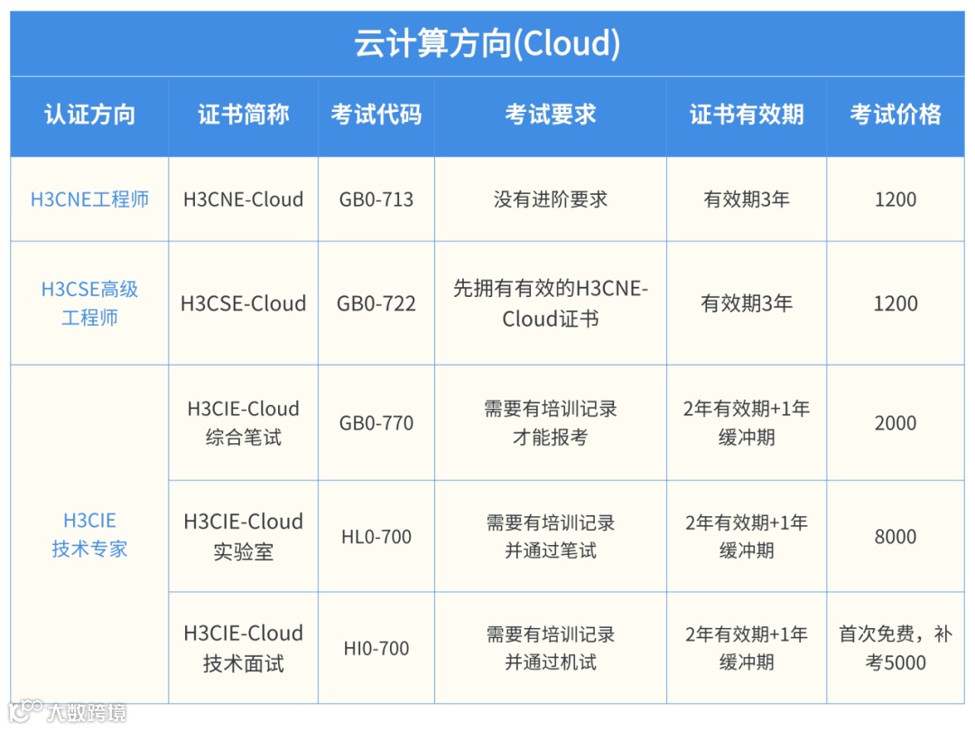 专家级:H3CIE-Cloud 通过笔试(GB0-770,2000 元)、实验室考试(HLO-700,8000 元)、技术面试(补考 5000 元),证书有效期 2 年 + 1 年缓冲期。