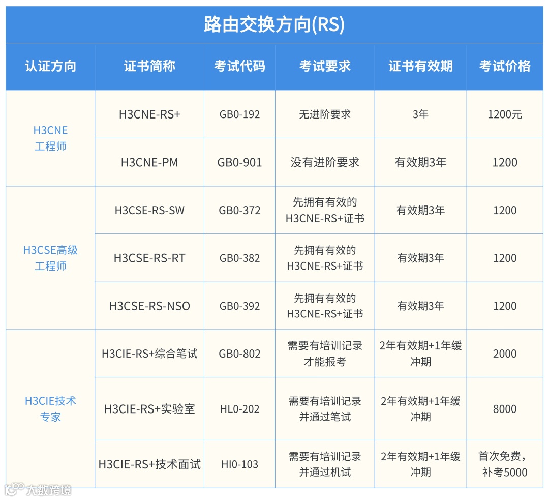 进阶级:H3CSE-RS-SW(GB0-372)、H3CSE-RS-RT(GB0-382)等,需持有有效 H3CNE-RS + 证书,有效期 3 年,单科 1200 元;