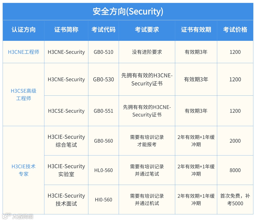 入门级:H3CNE-Security(GB0-510),无进阶要求,3 年有效期,1200 元;
