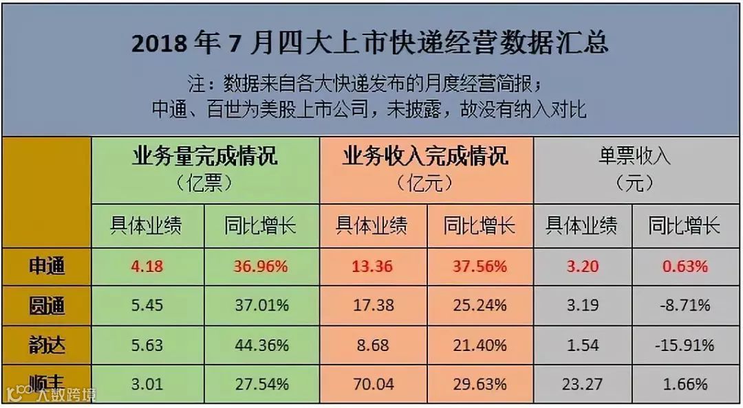 昨天,国内上市的四大快递巨头(顺丰、申通,圆通、韵达)如约发布了2018年7月份业绩经营简报。旺季大战之前,几大快递7月份的业绩表现确实值得关注,因为可以透露出很多讯息和信号。比如: