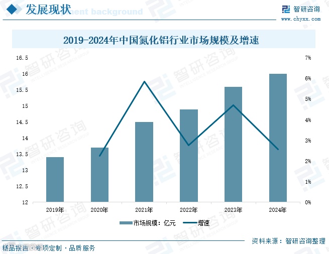 随着智能手机、计算机、5G基站等高性能电子产品需求增长,市场对高导热、高稳定性的电子基板材料需求不断提升。氮化铝基板凭借优异的热导性和电绝缘性,广泛应用于LED、功率半导体、射频组件等领域,成为提升电子产品性能的关键材料。2023年中国氮化铝行业市场规模达15.6亿元,较2019年的13.4亿元稳步增长,预计2024年将达16亿元,同比增长2.56%。
