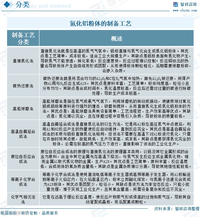 氮化铝粉体的主要制备工艺包括直接氮化法和碳热还原法,此外还有自蔓延合成法、高能球磨法、原位自反应合成法、等离子化学合成法及化学气相沉积法等。