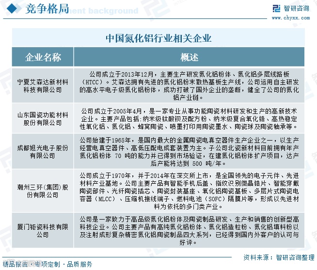 目前具备氮化铝生产能力的国内企业主要有:宁夏艾森达新材料科技有限公司、山东国瓷功能材料股份有限公司、成都旭光电子股份有限公司、潮州三环(集团)股份有限公司、厦门钜瓷科技有限公司等。