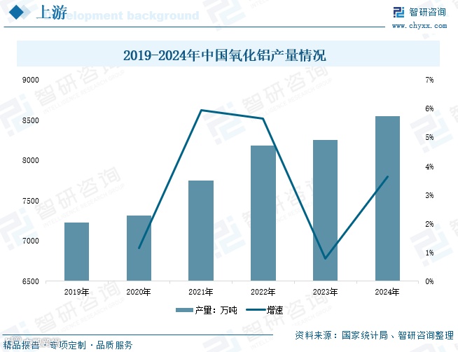 中国是全球最大的氧化铝生产国和消费国。尽管铝土矿资源相对匮乏,对外依存度接近70%,但氧化铝产量持续增长。国家统计局数据显示,2024年中国氧化铝产量达8552.2万吨,同比增长3.65%。充足的氧化铝供应为氮化铝产业发展提供了有力支撑。