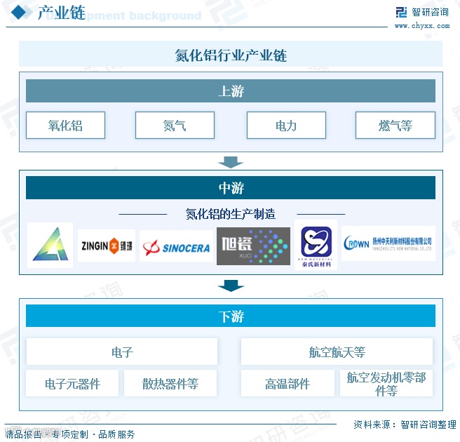 氮化铝产业链上游主要包括原材料和能源。原材料以氧化铝、氮气为主,其纯度直接影响产品性能;能源方面依赖电力和燃气,供应稳定性与成本影响生产成本与市场价格。中游为氮化铝粉体及陶瓷制品的生产制造环节。下游广泛应用于电子、航空航天、汽车等领域,尤其在高性能电子元器件和高温部件制造中发挥关键作用。