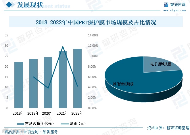 市场规模持续扩大,2022年中国PET保护膜市场规模达28.68亿元,同比增长4.25%,2018–2022年复合增长率为6.44%。其中电子领域占比最高,达22.6%。