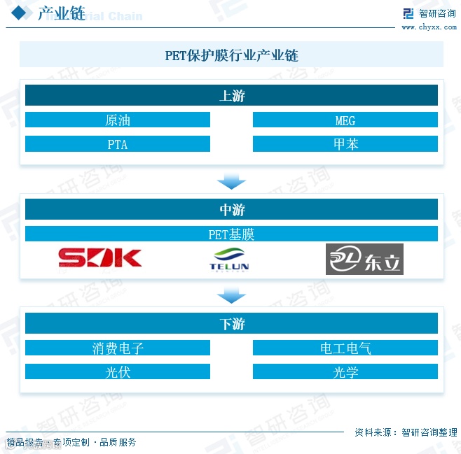 PET保护膜产业链上游为石油化工行业,主要原材料为PTA(精对苯二甲酸)和MEG(乙二醇);中游为PET基膜生产环节;下游广泛应用于消费电子、电工电气、光伏、光学、汽车等行业。作为新材料产业的重要组成部分,该行业关联度高、应用范围广,对我国电子制造等支柱产业具有显著推动作用,属于国家重点支持发展的领域。