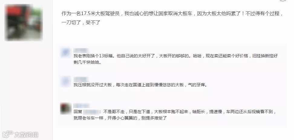 更是有17.5米大板车司机表示同意取消大板车,他表示开大板车太累了,受不了。