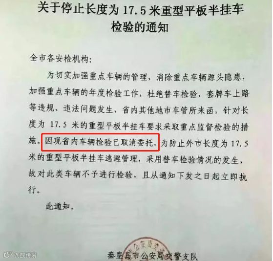 河北、上海、成都等地更是发布了相关通知:为防止替车检验、套牌等逃避管理的情况,即日起不接受外地17.5米大板车的年检委托。
