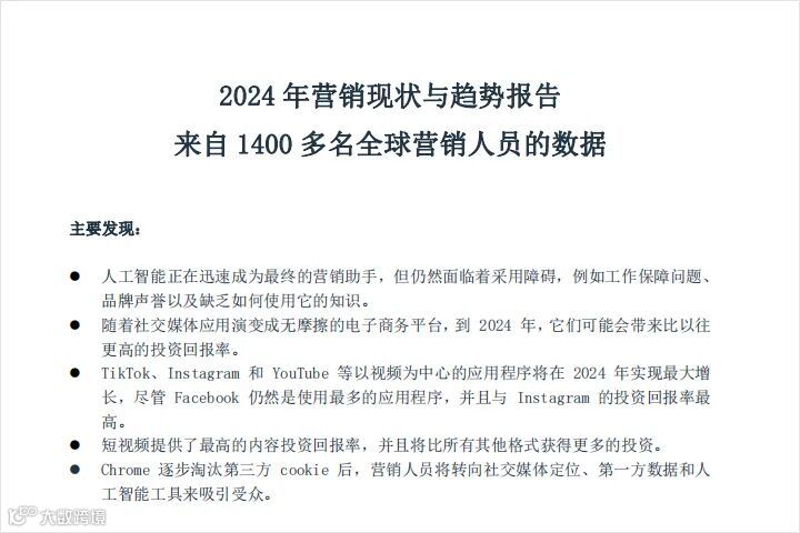 综上,2024年营销趋势聚焦于AI技术应用深化、社交电商融合、视频内容主导、影响者合作优化、隐私合规应对及数据体系整合,全面提升营销智能化与精准化水平。