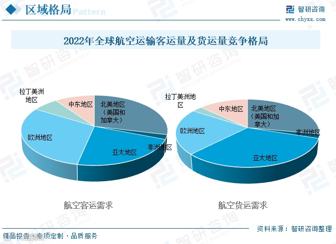 按收入客公里(RPK)计算,2022年全球航空客运需求分布为:欧洲30.4%、北美28.8%、亚太22.4%、中东9.8%、拉丁美洲6.4%、非洲2.1%。