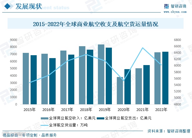 航空运输在推动全球化和经济发展中发挥关键作用。2022年,全球航空货运需求逐步恢复至接近2019年水平,较2021年有所回落。自2020年初疫情爆发以来,航空业经历严重冲击;2022年起,航企经营状况明显改善。当年全球商业航空总收入约7270亿美元,同比增长43.68%;总支出约7370亿美元,同比增长33.76%。