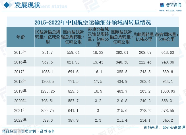 中国已成为全球航空产业增长最快的国家之一。2021年,民航全行业完成运输总周转量856.75亿吨公里,同比增长7.3%;2022年完成599.3亿吨公里,同比下降30.1%。其中,国内航线周转量387.9亿吨公里,港澳台航线2.3亿吨公里,国际航线211.4亿吨公里;旅客周转量345.20亿吨公里,货邮周转量254.1亿吨公里。