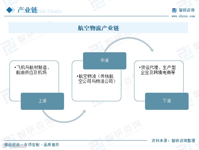 航空物流产业链长、环节多、管理复杂,主要分为上游、中游和下游三个环节。上游包括飞机与航材制造、航油供应及机场基础设施;中游主体为航空公司和专业物流公司;下游涵盖货运代理、生产制造企业和跨境电商等终端用户。