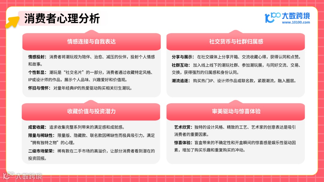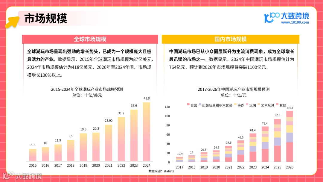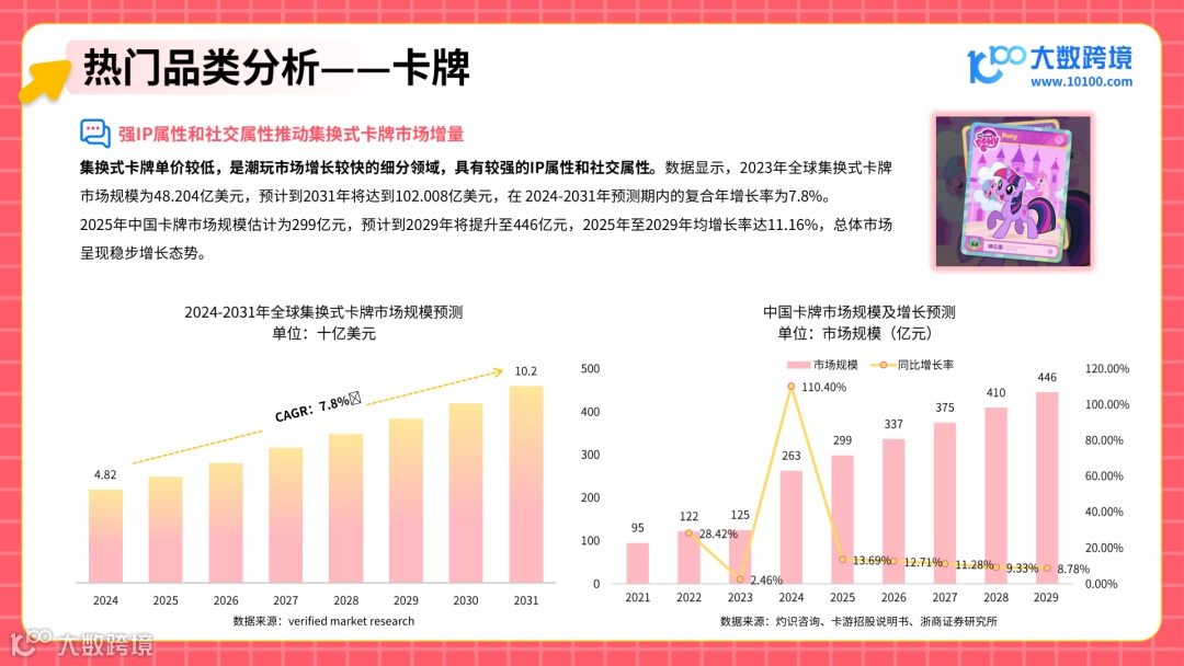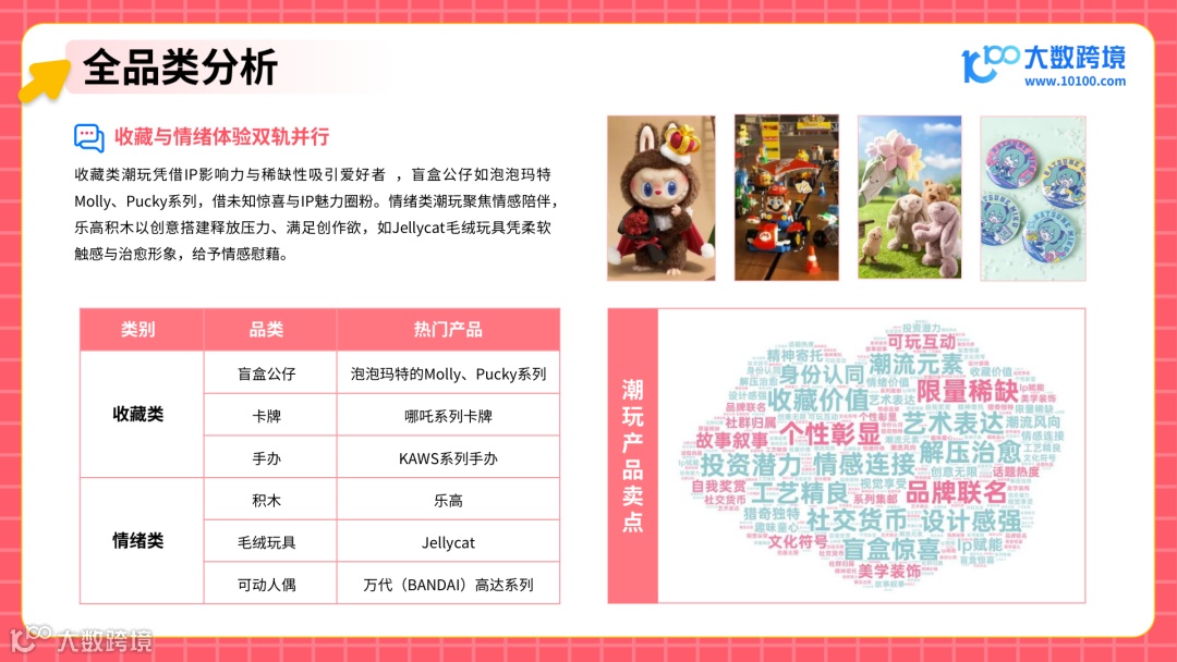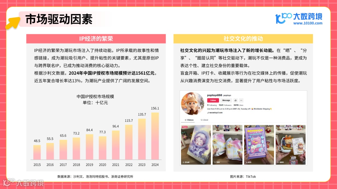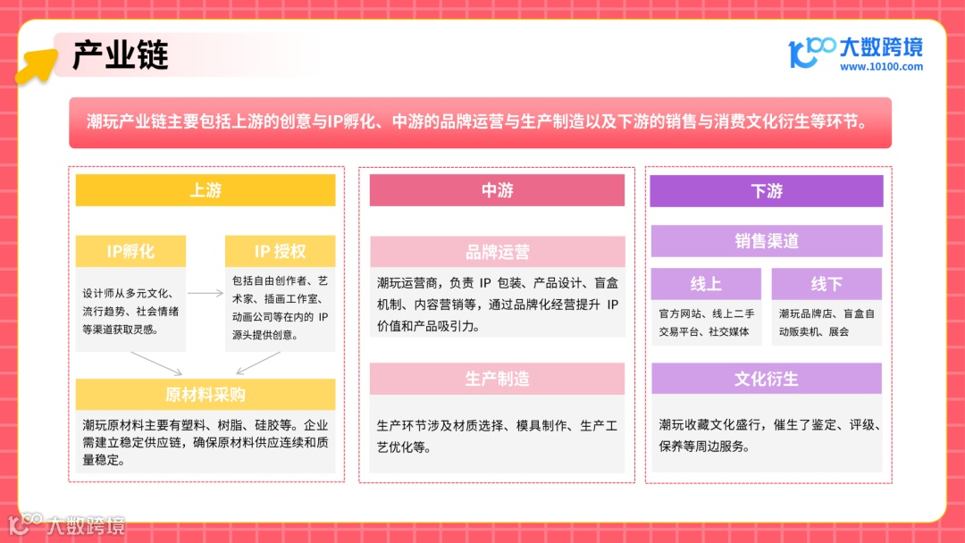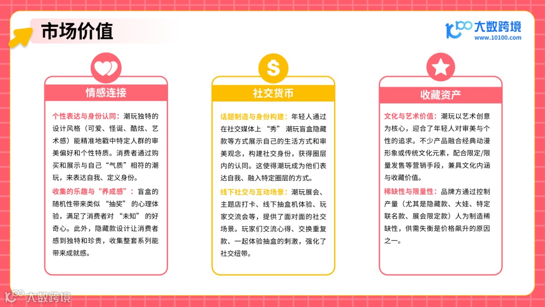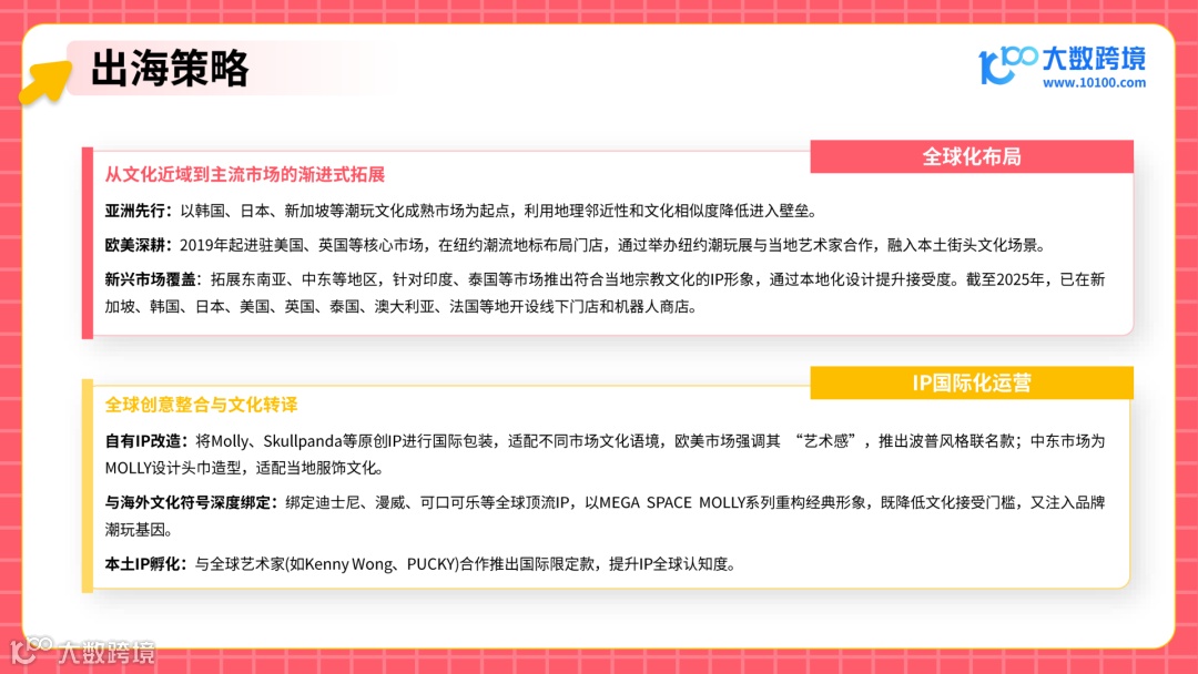 导读:报告聚焦中国潮玩品牌全球化布局,剖析行业现状、市场趋势与出海策略。潮玩市场以盲盒、艺术玩具、IP衍生模型为核心,依托IP情感链接与稀缺性设计,成为Z世代精神消费与社交货币。2023年全球集换式卡牌市场规模达48.2亿美元,预计2031年增至102亿美元,中国潮玩出口金额持续攀升,出海潜力显著。头部品牌探索多元出海路径:泡泡玛特已进入23个海外国家,TikTok粉丝超240万,凭借“普通款+隐藏款”模式刺激复购,隐藏款二手溢价可达百倍;卡游推出《小马宝莉》英文版卡牌打入东南亚市场,哪吒系列卡牌引发代开热潮;Jellycat毛绒玩具因治愈属性热销全球,2024年市场规模达113.2亿美元,线上渠道增速为11.2%。报告指出,潮玩出海面临文化适配与审美差异挑战。建议品牌加强原创IP孵化,构建“全球主账号+区域子账号”营销体系,重点布局TikTok等社交平台;完善合规与知识产权保护机制,优化全球分销网络,通过本地化运营实现品牌价值传递与文化共鸣,把握全球潮玩消费升级机遇。
