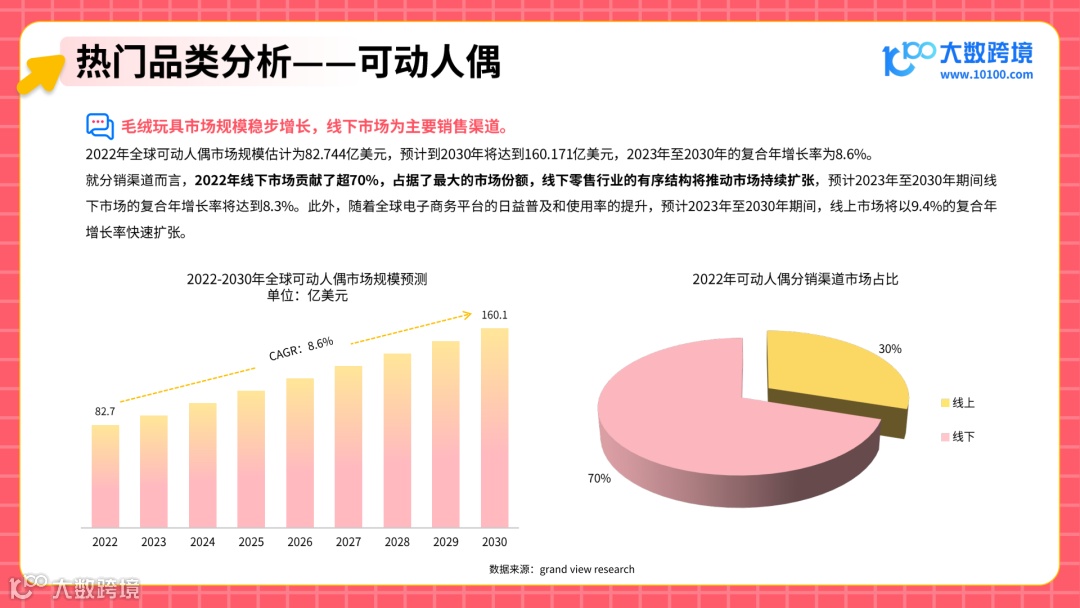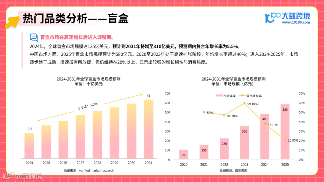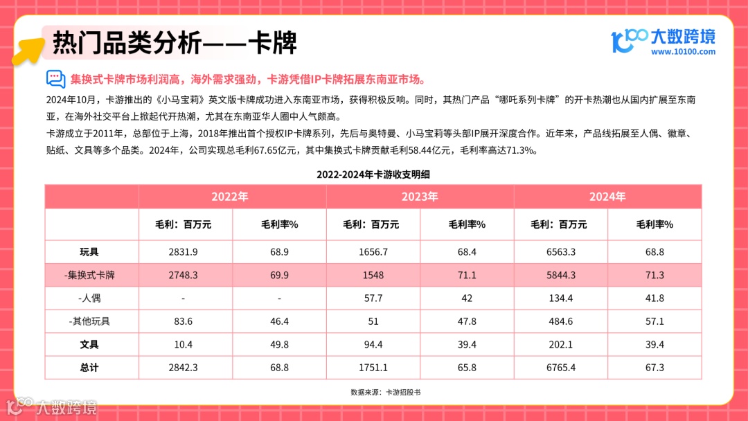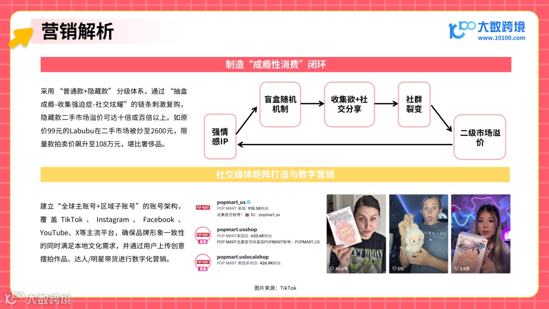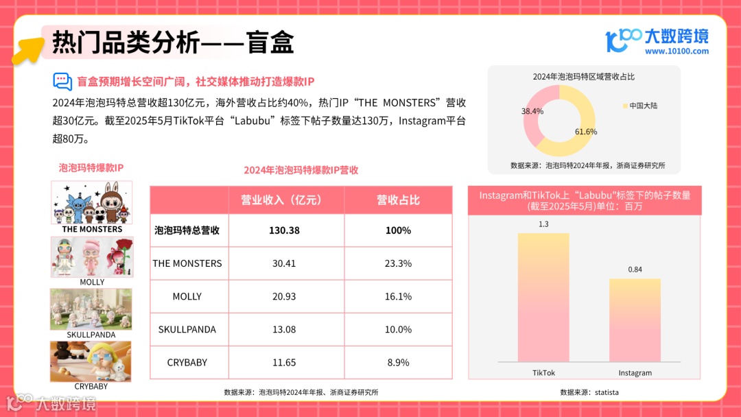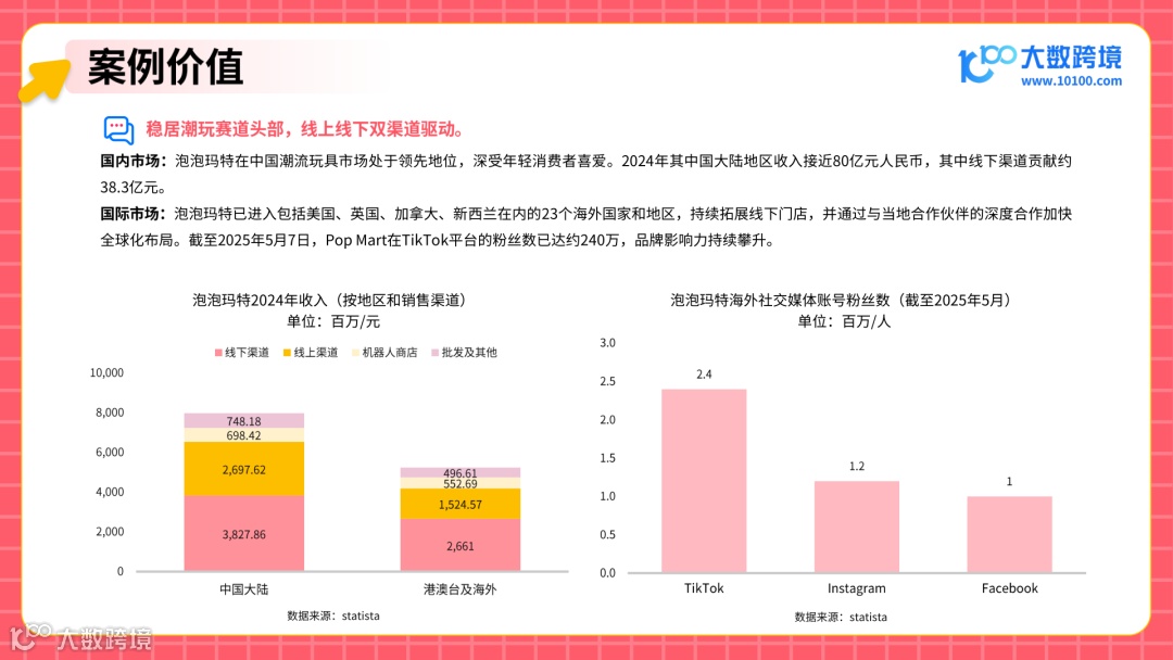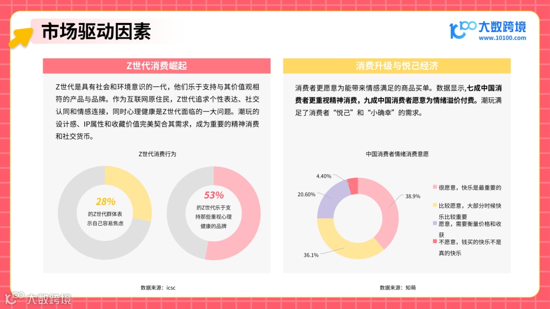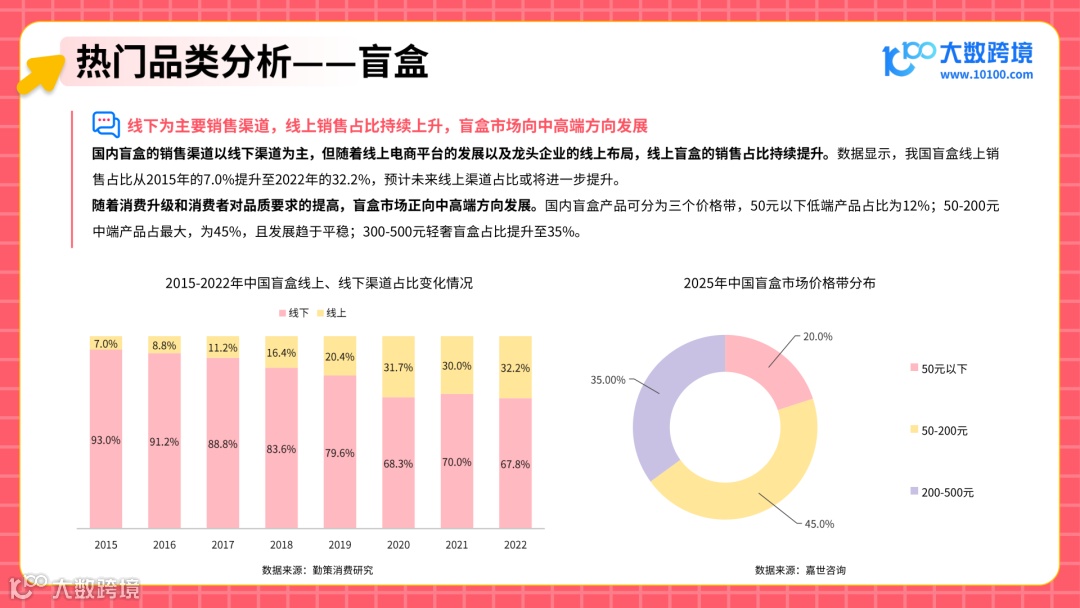 导读:报告聚焦中国潮玩品牌全球化布局,剖析行业现状、市场趋势与出海策略。潮玩市场以盲盒、艺术玩具、IP衍生模型为核心,依托IP情感链接与稀缺性设计,成为Z世代精神消费与社交货币。2023年全球集换式卡牌市场规模达48.2亿美元,预计2031年增至102亿美元,中国潮玩出口金额持续攀升,出海潜力显著。头部品牌探索多元出海路径:泡泡玛特已进入23个海外国家,TikTok粉丝超240万,凭借“普通款+隐藏款”模式刺激复购,隐藏款二手溢价可达百倍;卡游推出《小马宝莉》英文版卡牌打入东南亚市场,哪吒系列卡牌引发代开热潮;Jellycat毛绒玩具因治愈属性热销全球,2024年市场规模达113.2亿美元,线上渠道增速为11.2%。报告指出,潮玩出海面临文化适配与审美差异挑战。建议品牌加强原创IP孵化,构建“全球主账号+区域子账号”营销体系,重点布局TikTok等社交平台;完善合规与知识产权保护机制,优化全球分销网络,通过本地化运营实现品牌价值传递与文化共鸣,把握全球潮玩消费升级机遇。