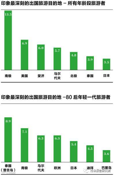 南极以13.5%位列“最难忘旅程”榜首,美国(6.9%)、斐济(6.0%)分列二三位。南极以其原始冰川、广袤雪原及企鹅、海豹等特有动物,提供独一无二的探险体验。