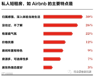 高端旅游者认为Airbnb最大优势是“深入体验当地生活”(30%),其次为“家庭氛围”(22%)和“价格优惠”(12%)。房间特色(9%)、房源数量(7%)、房东热情(3%)关注度较低。
