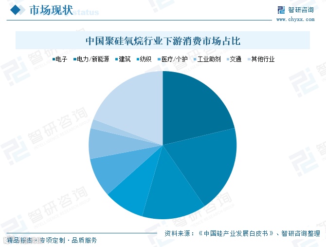 当前我国聚硅氧烷主要用于硅橡胶生产,占比高达70%,是拉动消费的核心领域。终端应用中,电子(21.3%)、电力/新能源(19.1%)、建筑(14.1%)和纺织(8.9%)为主要消费行业。其中,传统领域如建筑、纺织需求占比逐年下降,而电子、新能源等领域需求持续上升。