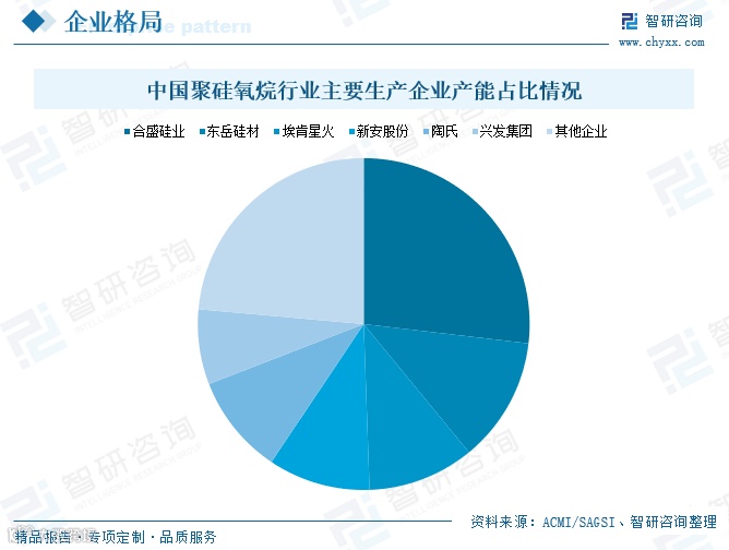 我国聚硅氧烷生产企业数量有限,市场集中度较高,CR6超过75%,呈现“一超多强”的竞争格局。合盛硅业为行业龙头,产能达62.1万吨,产量51.1万吨,居全国首位;东岳硅材紧随其后,产能28.2万吨,产量24.9万吨。此外,埃肯星火、新安股份、陶氏、兴发集团等企业在行业内也具备较强竞争力。