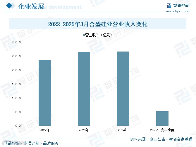 合盛硅业成立于2005年,2017年在上交所上市,主营工业硅、有机硅及多晶硅等硅基新材料,是我国产业链最完整、规模最大的硅基材料企业之一。截至2024年末,公司拥有工业硅产能122万吨/年、有机硅单体产能173万吨/年,行业龙头地位稳固。2024年及2025年第一季度营业收入分别为266.92亿元和52.28亿元,同比变化0.41%和-3.47%。