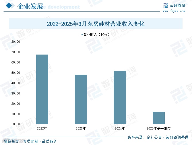山东东岳有机硅材料股份有限公司成立于2006年,2020年在深交所创业板上市,专注于有机硅材料的研发、生产和销售,具备从金属硅粉到下游深加工产品的全产业链能力,主营硅橡胶、硅油、硅树脂及气相白炭黑等。2024年及2025年第一季度营业收入分别为51.51亿元和12.02亿元,同比增幅7.27%和-15.68%。