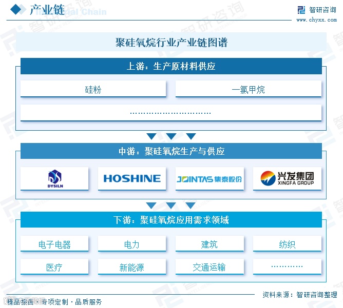 聚硅氧烷行业上游主要依赖硅粉和一氯甲烷等原材料;中游由兴发集团、东岳硅材、合盛硅业等企业主导生产;下游则用于制造硅油、硅橡胶、硅树脂等产品,终端应用覆盖电子电器、电力、新能源、建筑、纺织、医疗及交通运输等行业。