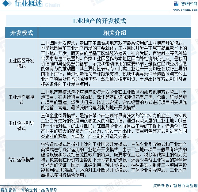 主要开发模式包括工业园区开发、工业地产商主导、主体企业引导和综合运作四种。其中,由地方政府开发区或园区管委会下属开发公司主导的工业园区模式是我国当前最主要的发展路径。