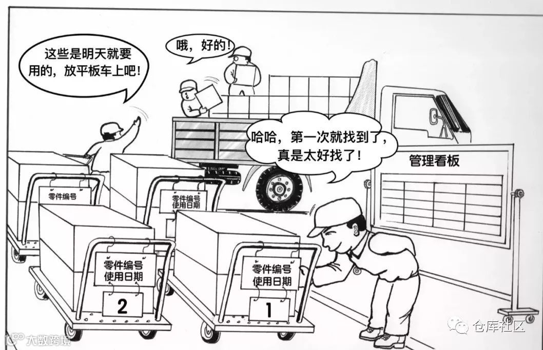 对于那些无法放置在货架上的货品。需要在现货上标注上日期,这个日期可以是进货日期也可以是制造日期。当指示需要发货的时候,就按照日期的顺序从早到晚的顺序提货。如果现场的5S极其规范,做好了位置管理,就能够明确下达指示应该从那里提货。