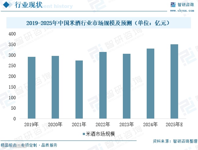 米酒是中国最古老的酒类之一,历史可追溯至新石器时代,是传统饮食文化的重要组成部分。经过多年发展,已形成完整产业链,成为酒类产业中的特色分支。在健康消费理念驱动下,米酒凭借低酒精度、营养丰富及文化积淀,市场保持稳健增长。2024年中国米酒行业市场规模约达330亿元,同比增长8.2%。预计2025年将突破350亿元,受益于年轻消费群体扩大、产品创新加速(如气泡米酒、功能性米酒)及消费场景多元化,行业将迎来新一轮发展机遇。