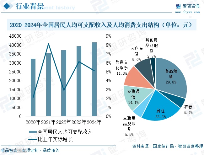 近年来,随着国民经济稳步增长和居民生活品质提升,全国居民人均可支配收入和消费支出持续上升。国家统计局数据显示,2024年全国居民人均可支配收入为41314元,同比增长5.3%(实际增长5.1%);人均消费支出达28227元,同比亦增长5.3%。其中,食品烟酒类支出占比达29.8%,为米酒行业提供了广阔的市场空间和发展动力。