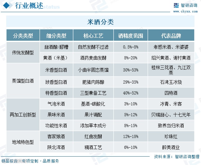 米酒行业是以大米、糯米等谷物为主要原料,通过发酵工艺制成酒类产品的生产与销售领域,兼具低度酒的柔和口感与发酵饮品的营养特性,在中国酒文化中具有重要地位。根据工艺与风味特征,米酒主要分为三类:传统发酵型米酒以甜酒酿、醪糟为代表,酒精度低、口感甜润,适用于直接饮用或烹饪;黄酒类米酒如绍兴黄酒、花雕酒,采用非蒸馏发酵工艺,酒精度10%-20%,酒体呈琥珀色至深褐色,风味丰富,兼具饮用与收藏价值;蒸馏型米酒如桂林三花酒、广东玉冰烧,经蒸馏后酒精度达20%-40%,酒体清澈,口感清爽,适合作为基酒或直接饮用。此外,果味米酒、黑糯米酒等创新品类不断涌现,满足多元化消费需求。
