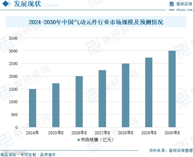 我国气动技术起步于20世纪80年代,经过四十多年发展,已实现规模扩张与质量提升的双重突破,产业体系日趋完善。凭借结构简单、运行可靠、环保节能、寿命长等优势,气动元件已成为现代工业驱动系统的核心组成部分。产品涵盖气缸、减压阀、溢流阀、气动马达、过滤器等多种类型。2024年中国气动元件市场规模达1500亿元,预计到2030年将突破3000亿元,在制造业升级和新兴产业发展的推动下,行业有望保持稳健增长。