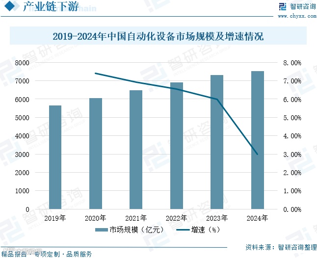 自动化设备是气动元件的重要下游市场,涵盖汽车制造、工程机械、石油化工、物流仓储、医药制造、半导体等多个行业。近年来,随着制造业转型升级加速,国内自动化设备技术水平不断提升,部分关键领域实现突破。2024年中国自动化设备市场规模达7534亿元,较2019年增长33.5%,年复合增长率为5.95%,市场需求持续释放。