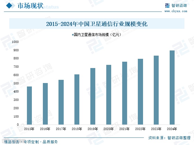 我国卫星通信起步较晚,但经过五十年发展,已实现从无到有的跨越,成为少数具备自主设计与研发能力的国家之一。2015年至2021年,国内卫星通信市场规模从460亿元增至794亿元,年均复合增长率8.7%;2024年市场规模进一步提升至896亿元。