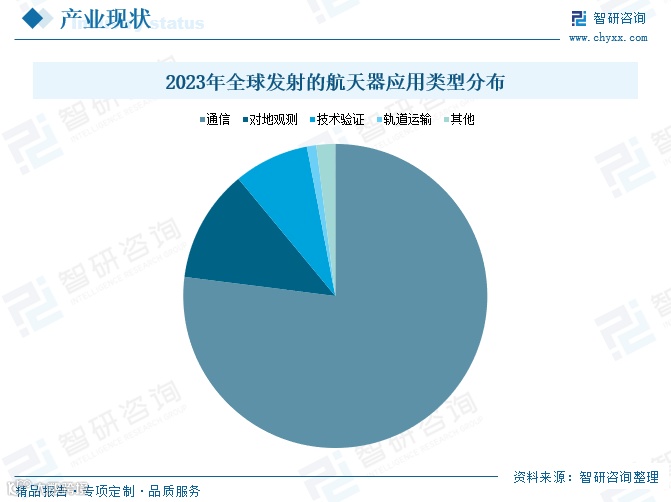 2023年全球共发射航天器2932个,其中通信卫星达2262颗,占比77%,较2022年增长14%。在全年发射的通信卫星中,仅36颗用于军事、政府或民用领域,其余2226颗均为商业用途,包括1984颗星链卫星、132颗一网卫星及其他低轨星座系统,凸显商业航天主导趋势。